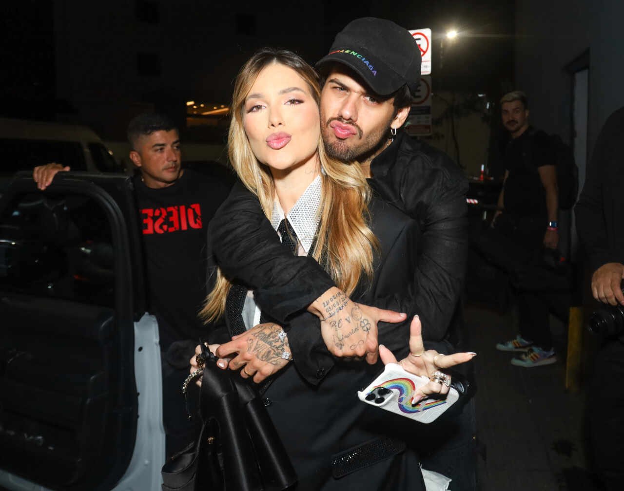 Virginia Fonseca deixa festa descalça e carregando sapatos na mão, abraçada a Zé Felipe